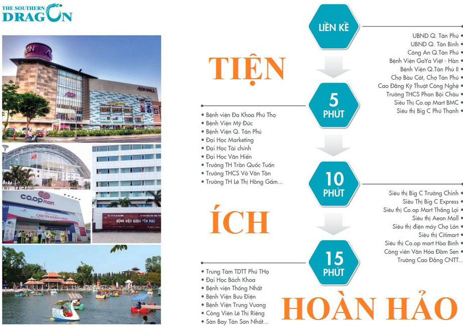 Khu căn hộ The Southern Dragon có những tiện ích ngoại khu nổi bật như: Aeon Mall, Pandora, Lotte Mart, Co.op Mart, công viên nước Đầm Sen, sân Tennis Bàu Cát, hệ thống trường học phổ thông chuẩn quốc tế…
