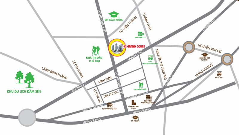 Tọa lạc ngay 4 mặt tiền đường Lý Thường Kiệt, quận 10. Từ Xi Grand Court, trong vòng bán kính 3 km cư dân có thể dễ dàng sử dụng những tiện ích như: